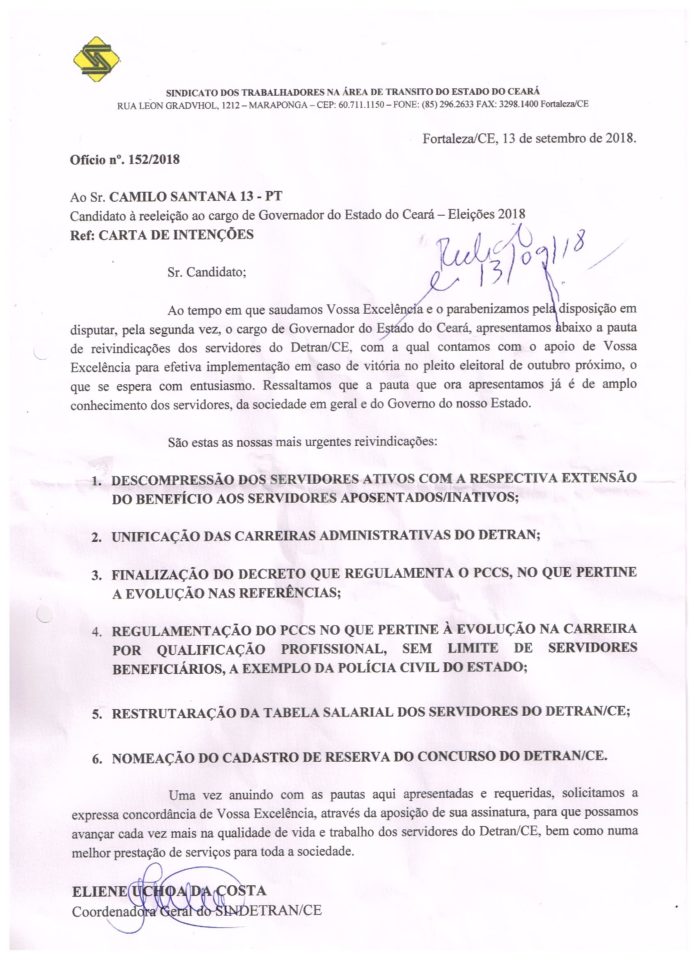 Na semana passada, encerramos nossas ações sindicais com promessas do governador Camilo Santana, que concorre à reeleição para o Palácio da Abolição. Durante articulação política em prol da categoria, visto que a superintendência do Departamento Estadual de Trânsito nada faz, apenas atrapalha as negociações deliberadas pela categoria, à diretoria do Sindetran/CE conversou com o executivo que, prometeu, caso seja reeleito, analisar cada ponto apresentado no documento abaixo.